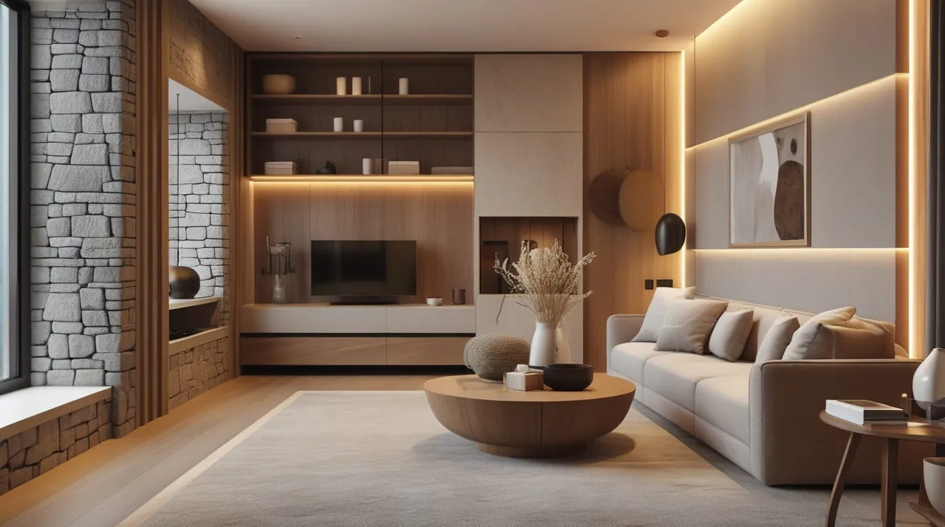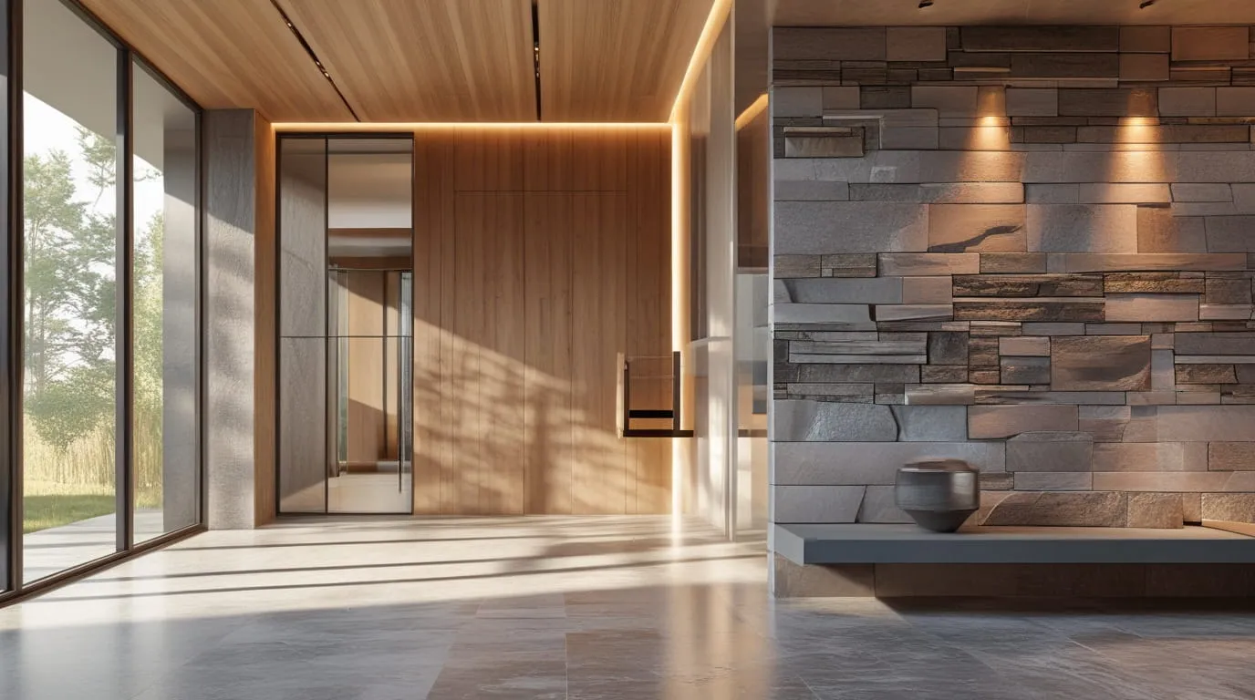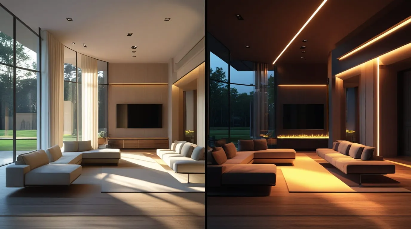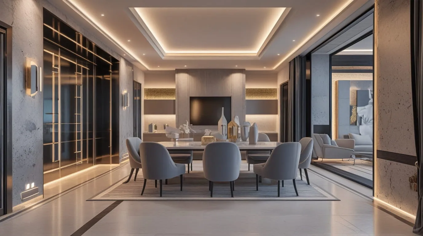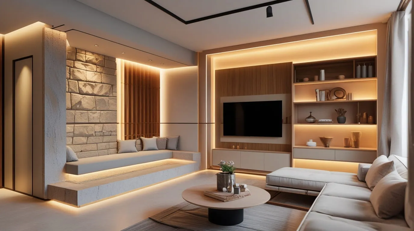 Layered lighting enhances mood, functionality, and highlights architectural features within the interior.