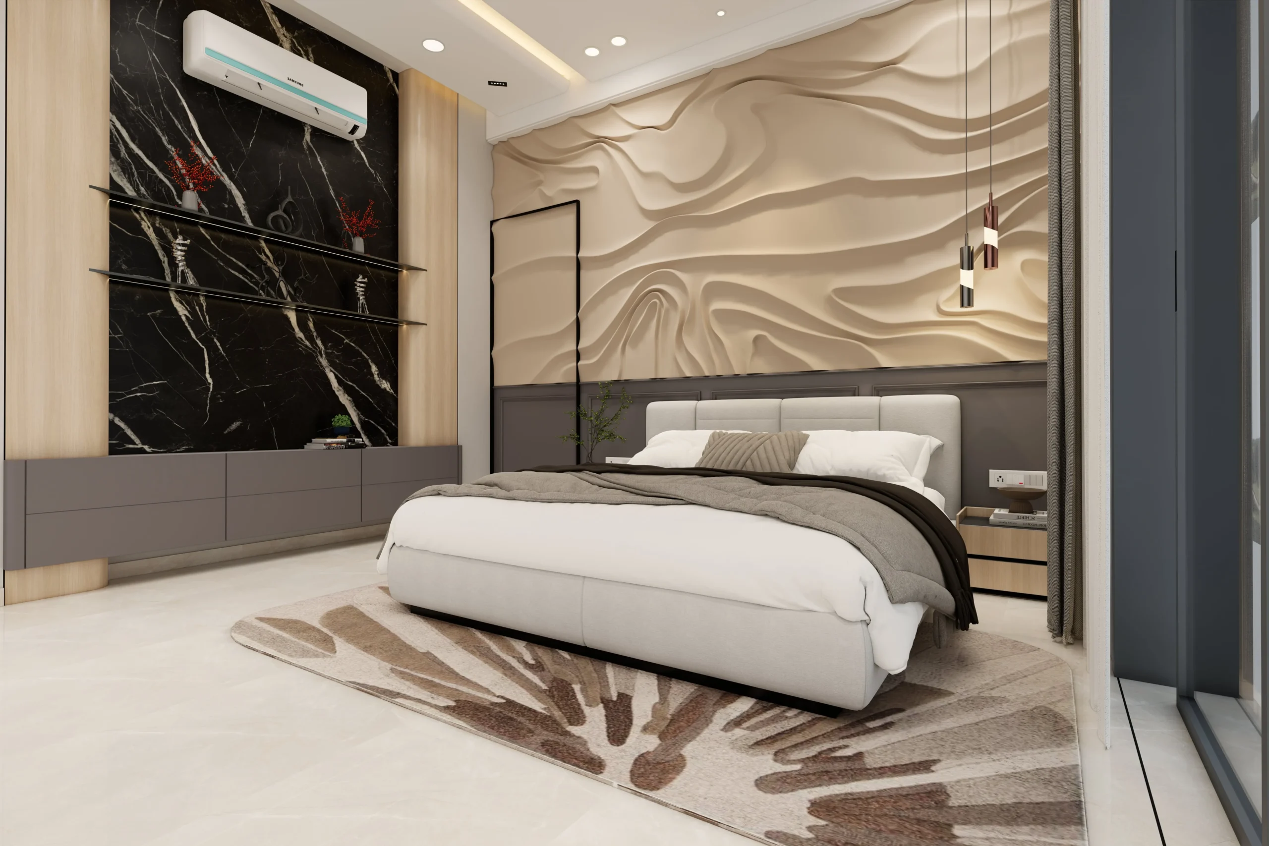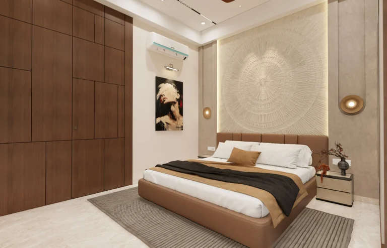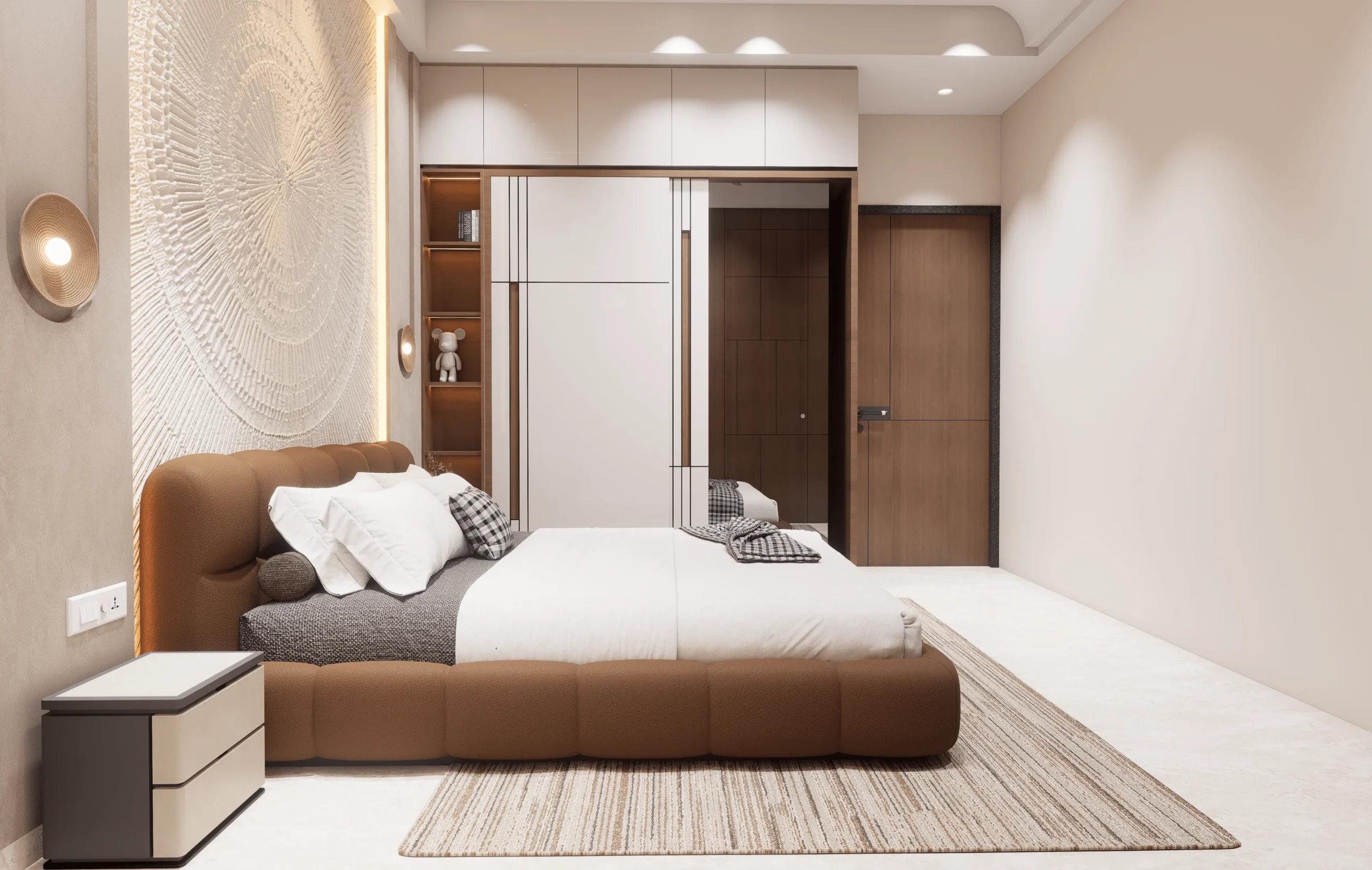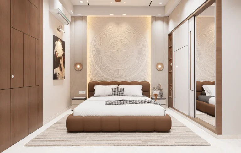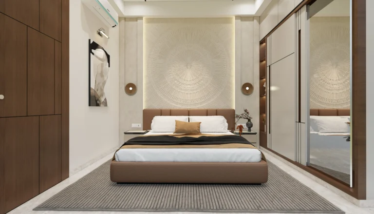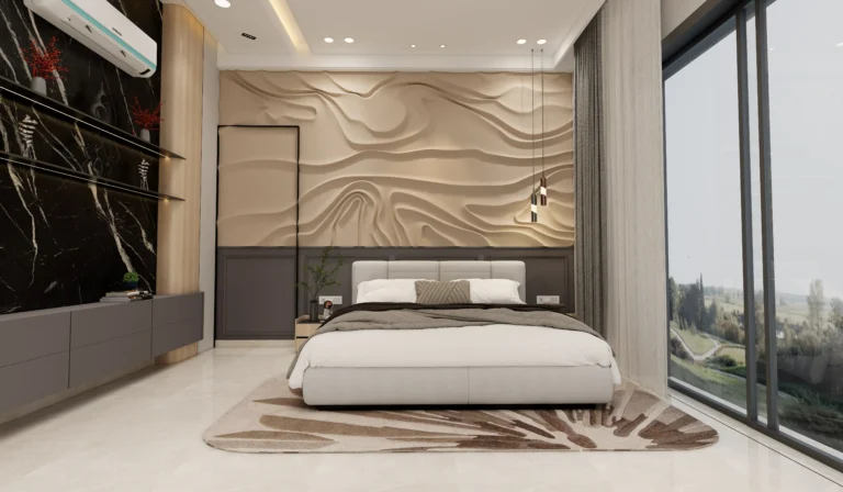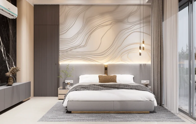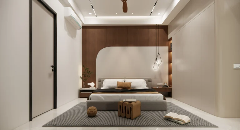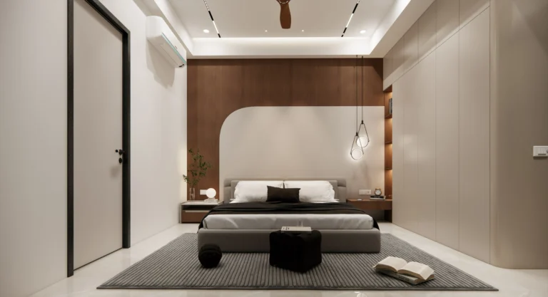 The master bedroom features clean wall panelling, gentle curves, and layered lighting that add depth while maintaining a minimal and refined look. Subtle textures and uncluttered furniture placement enhance the sense of openness and relaxation.