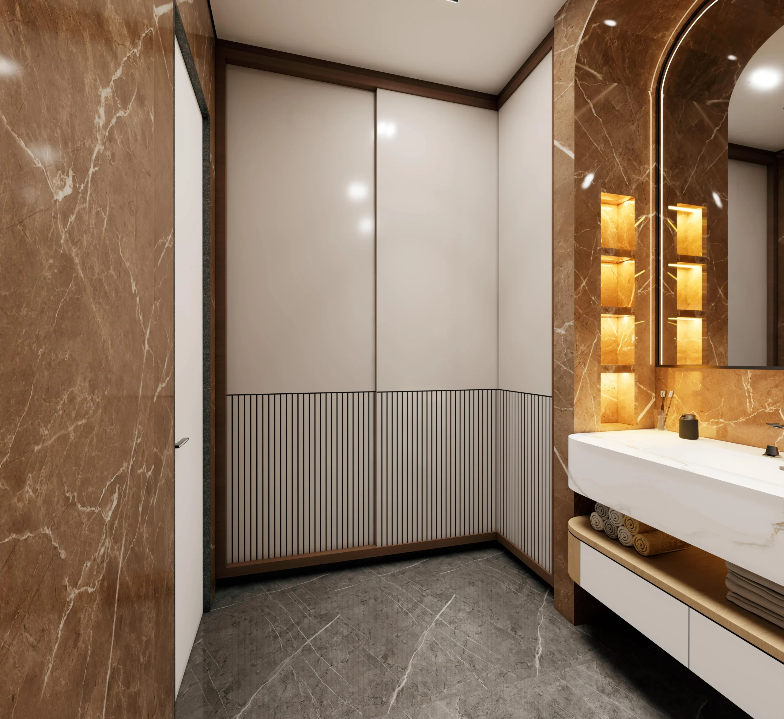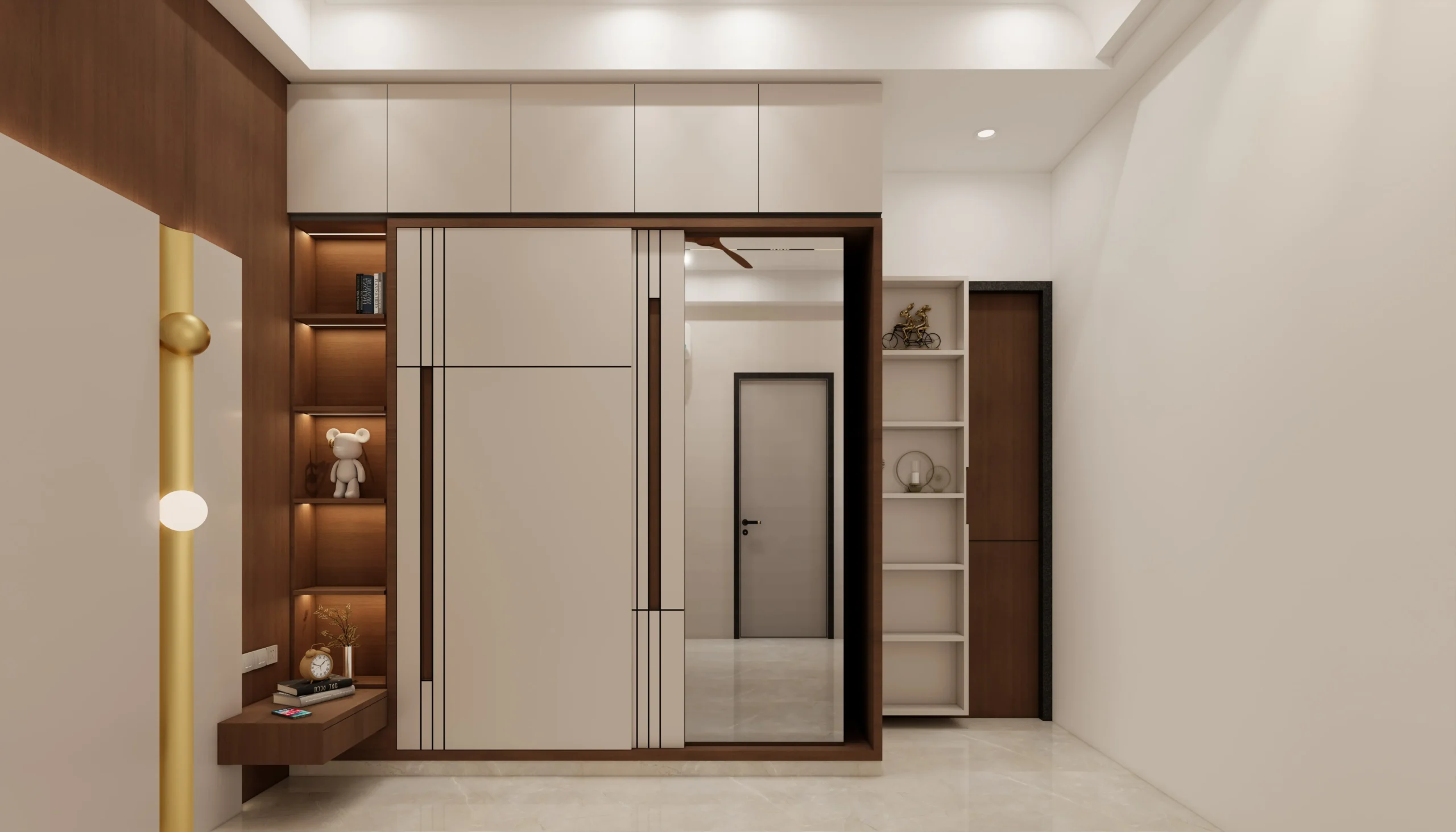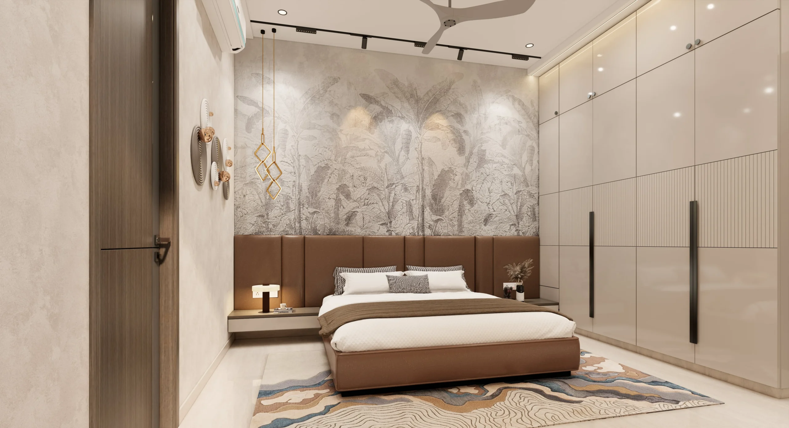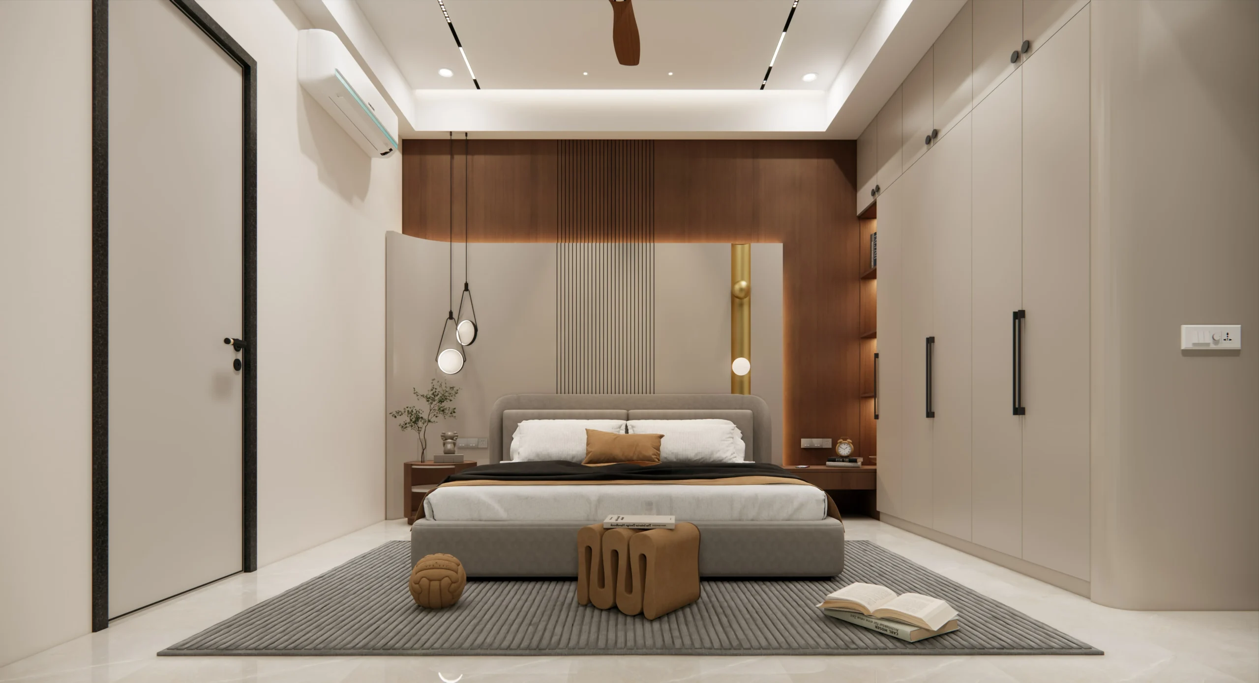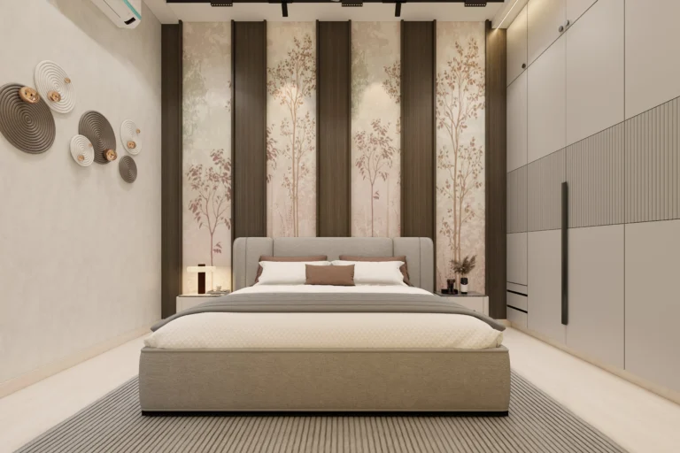 The master bedroom features clean wall panelling, gentle curves, and layered lighting that add depth while maintaining a minimal and refined look. Subtle textures and uncluttered furniture placement enhance the sense of openness and relaxation.