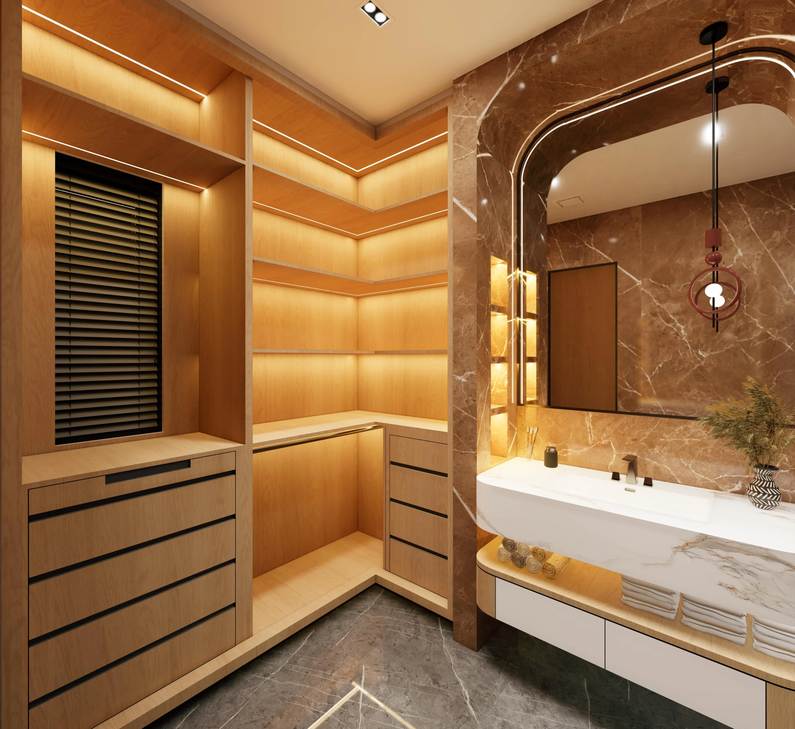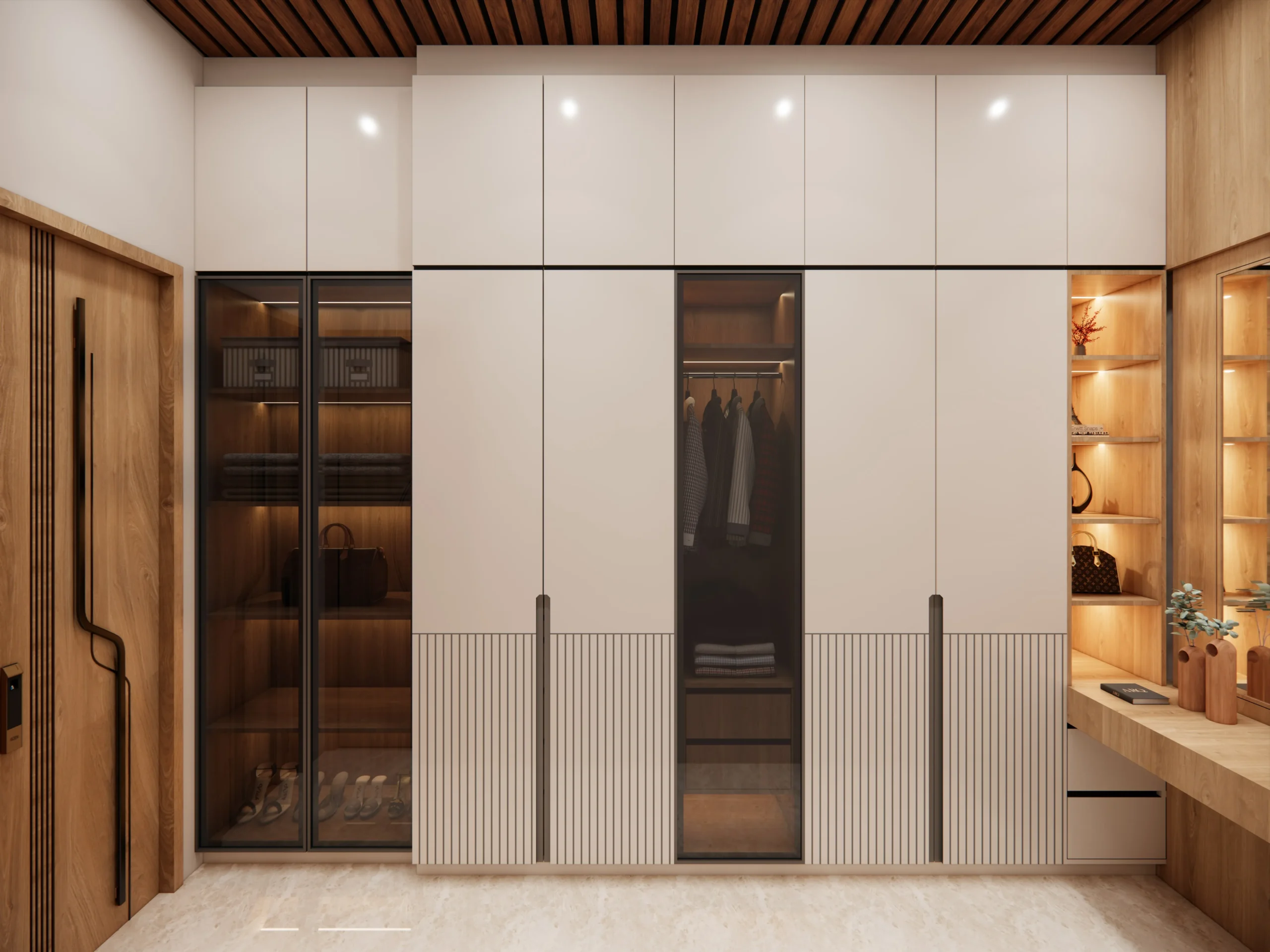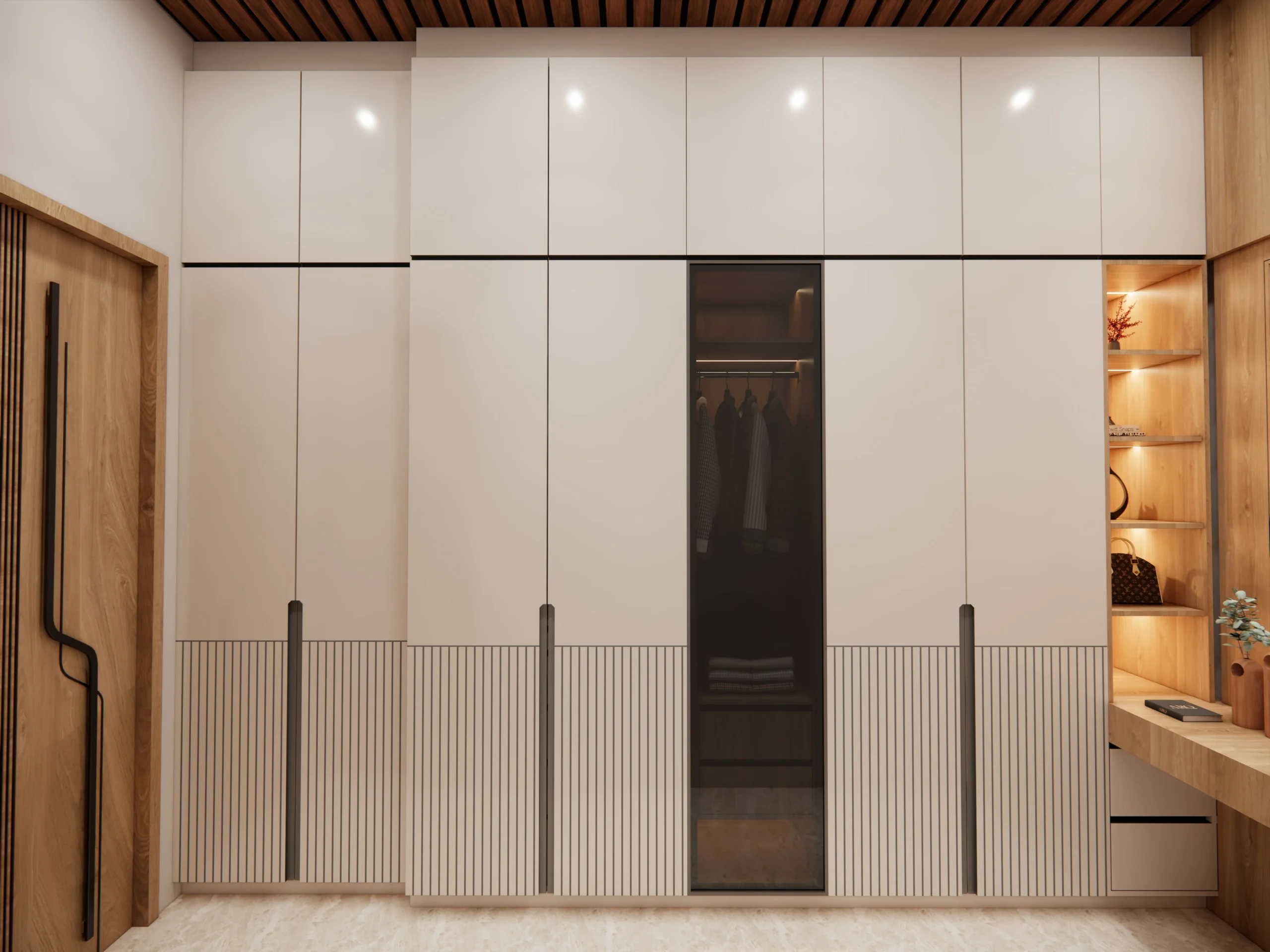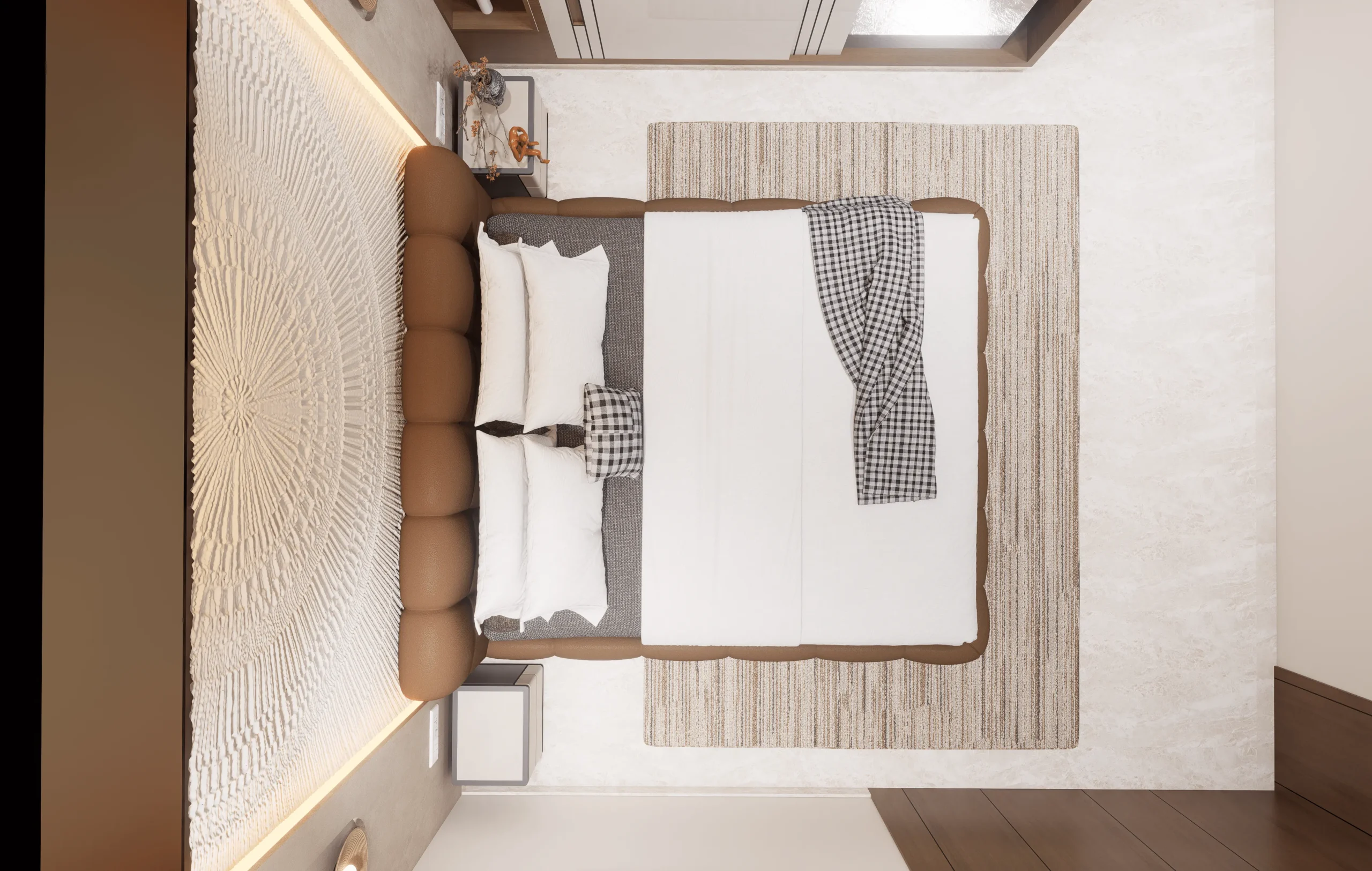 These bedroom interiors are designed with a focus on calm aesthetics, soft forms, and everyday comfort. Neutral tones are paired with warm wood finishes to create a soothing and cohesive visual language across the spaces.